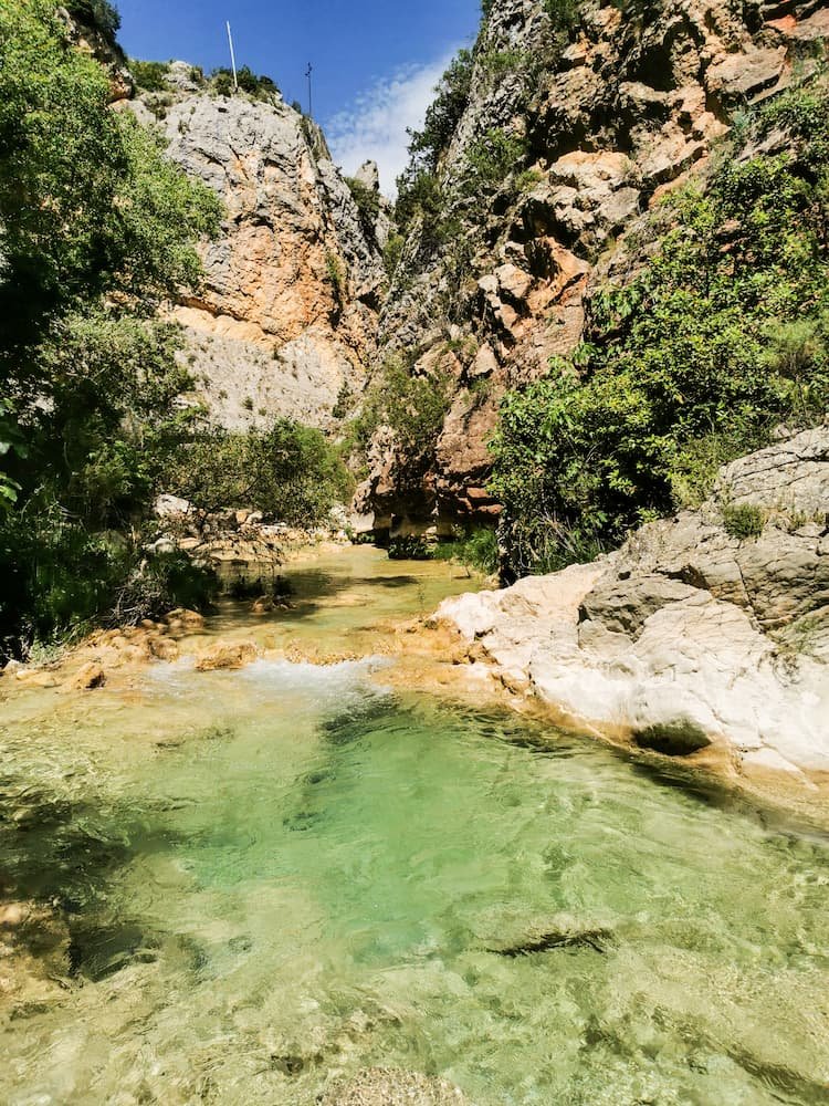 Les eaux du Rio Vero, aux teintes turquoise et laiteuses, contrastent avec les falaises calcaires ocres qui l’enserrent. Le décor est magnifique ! Nous passons également à côté d’un petit barrage (pared de la presa) d’où s’écoule une magnifique cascade, tandis que, dans le ciel, les vautours fauves planent régulièrement au-dessus des parois.